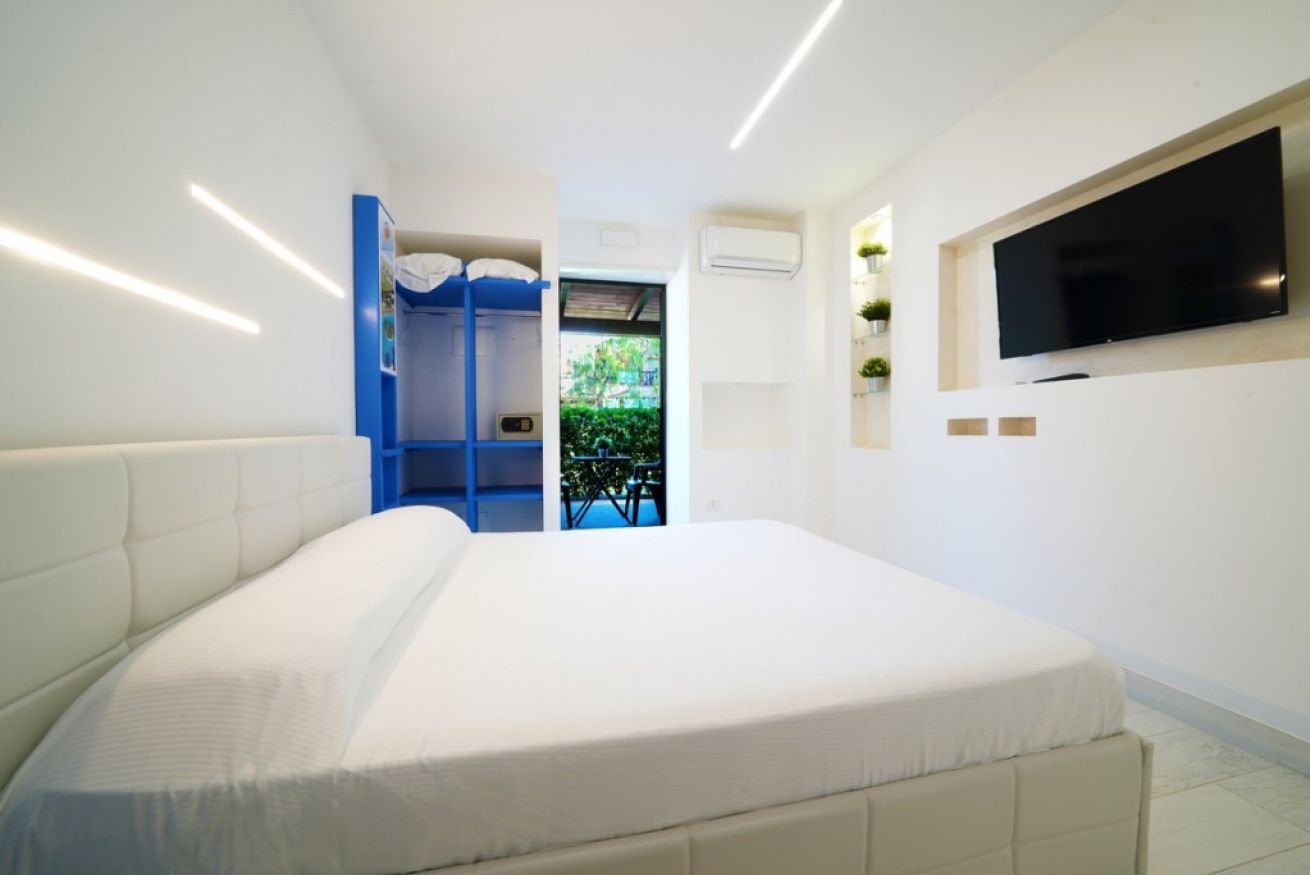 Goditi l’essenziale. Una camera accogliente, ideale per un soggiorno estivo all’insegna del comfort e della praticità.